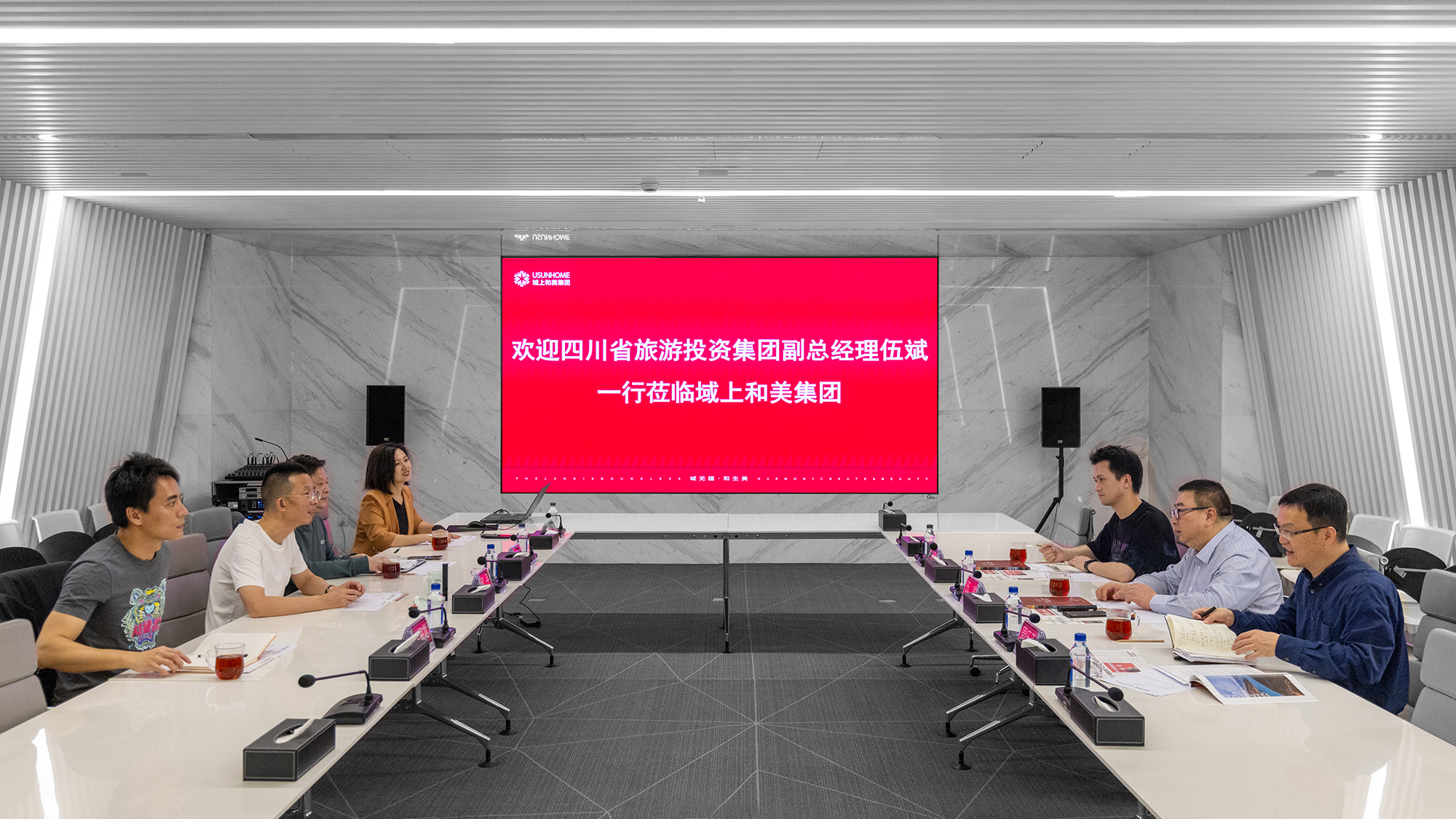 4月19日,四川旅投集團(tuán)副總經(jīng)理伍斌帶隊(duì)到訪域上和美集團(tuán)考察;域上和美集團(tuán)聯(lián)合創(chuàng)始人、副董事長(zhǎng)何平,集團(tuán)副總裁吳偉接待伍斌一行并舉行座談交流會(huì)。