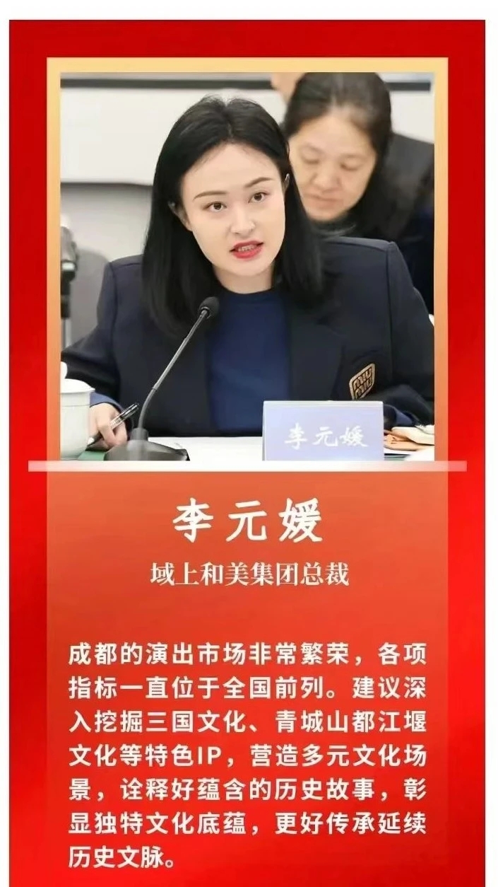 李元媛在發(fā)言中表示,成都的演出市場(chǎng)非常繁榮,各項(xiàng)指標(biāo)一直位居全國(guó)前列,建議深入挖掘三國(guó)文化、青城山都江堰文化等特色I(xiàn)P,營(yíng)造多元文化場(chǎng)景,詮釋好蘊(yùn)含的歷史故事,彰顯成都獨(dú)特文化底蘊(yùn),更好傳承延續(xù)歷史文脈。