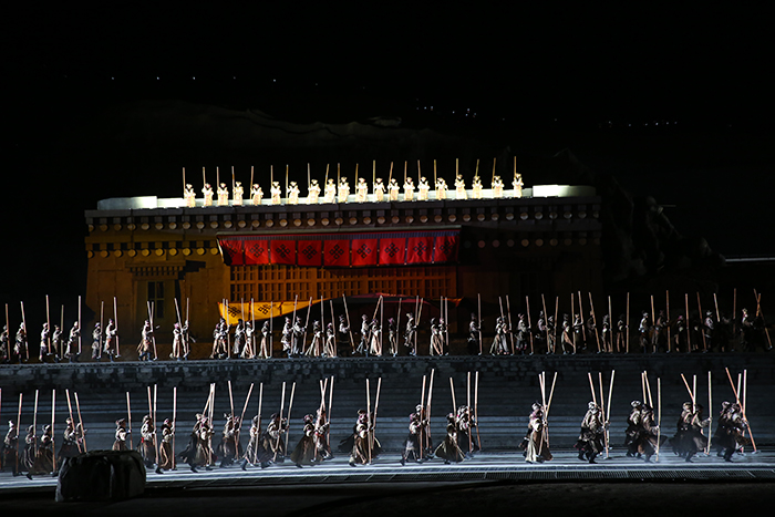 《文成公主》藏文化大型史詩劇在“序”的部分加入了山南的卓舞。氣勢磅礴的舞臺表現(xiàn)力可迅速把觀眾吸引到吐蕃人民當(dāng)時高亢豪放的生活風(fēng)情中。