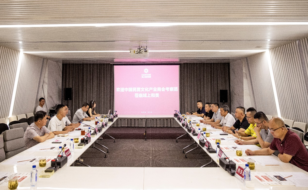 邱偉對中國民營文化產(chǎn)業(yè)商會考察團一行來訪表示歡迎,并介紹了集團近年來的發(fā)展情況。他介紹道,域上和美專注于文旅創(chuàng)意領域全產(chǎn)業(yè)鏈打造,秉持“輕重并舉、內(nèi)容領軍、跨界融合、國際拓展”的發(fā)展戰(zhàn)略,項目打造注重社會效益和經(jīng)濟效益的相統(tǒng)一,目前,域上和美集團在城市更新、鄉(xiāng)村振興、旅游演藝、文化園區(qū)、旅游景區(qū)等方面均有布局。邱偉表示,域上和美作為會員單位將持續(xù)積極參與商會工作,與業(yè)界同仁相互助力、攜手共進、優(yōu)勢互補、共謀發(fā)展。