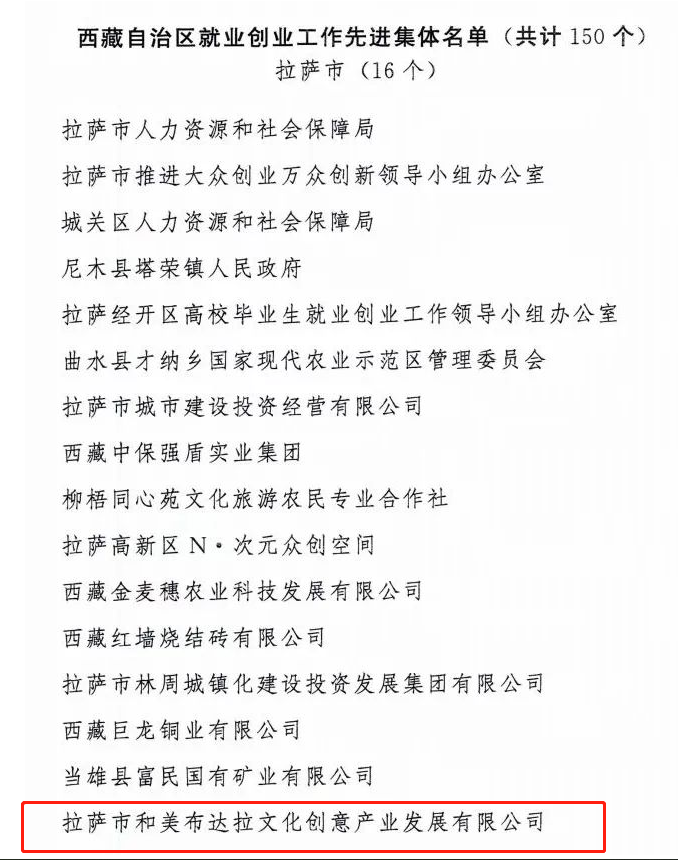 近日,西藏就業(yè)創(chuàng)業(yè)工作表彰大會(huì)在拉薩召開。西藏自治區(qū)黨委副書記、西藏自治區(qū)主席嚴(yán)金海講話,西藏自治區(qū)黨委常務(wù)副書記、西藏自治區(qū)政協(xié)黨組書記莊嚴(yán)主持會(huì)議。西藏自治區(qū)黨委常委賴蛟傳達(dá)王君正書記批示精神,西藏自治區(qū)黨委常委肖友才宣讀表彰決定。堅(jiān)參、江白、王勇出席。會(huì)上,域上和美集團(tuán)與拉薩布達(dá)拉旅游文化集團(tuán)共同組建的拉薩市和美布達(dá)拉文化創(chuàng)意產(chǎn)業(yè)發(fā)展有限公司(以下簡稱:和美布達(dá)拉公司)榮獲“西藏自治區(qū)就業(yè)創(chuàng)業(yè)工作先進(jìn)集體”稱號。