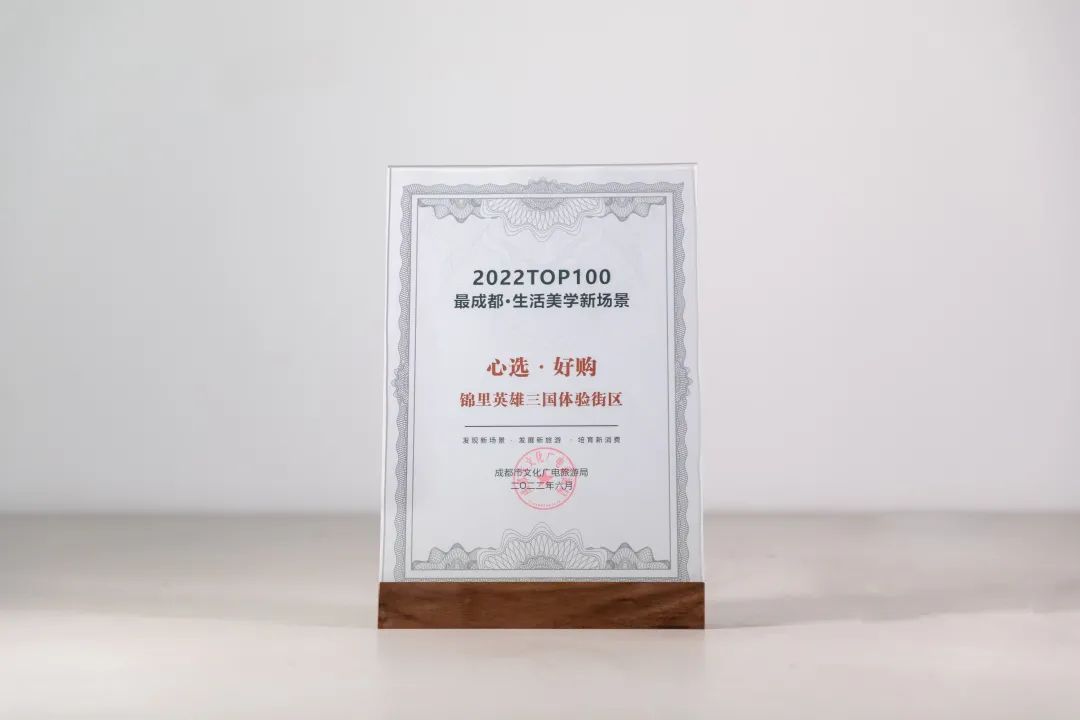6月23日,由成都市文化廣電旅游局主辦的“‘向往的生活在成都’——2022‘最成都·生活美學(xué)新場景’發(fā)布暨暑期游啟動儀式”上,武侯祠·錦里三國文化體驗街區(qū)成功入選2022 TOP100“最成都·生活美學(xué)新場景”——“心動·好購”類別。