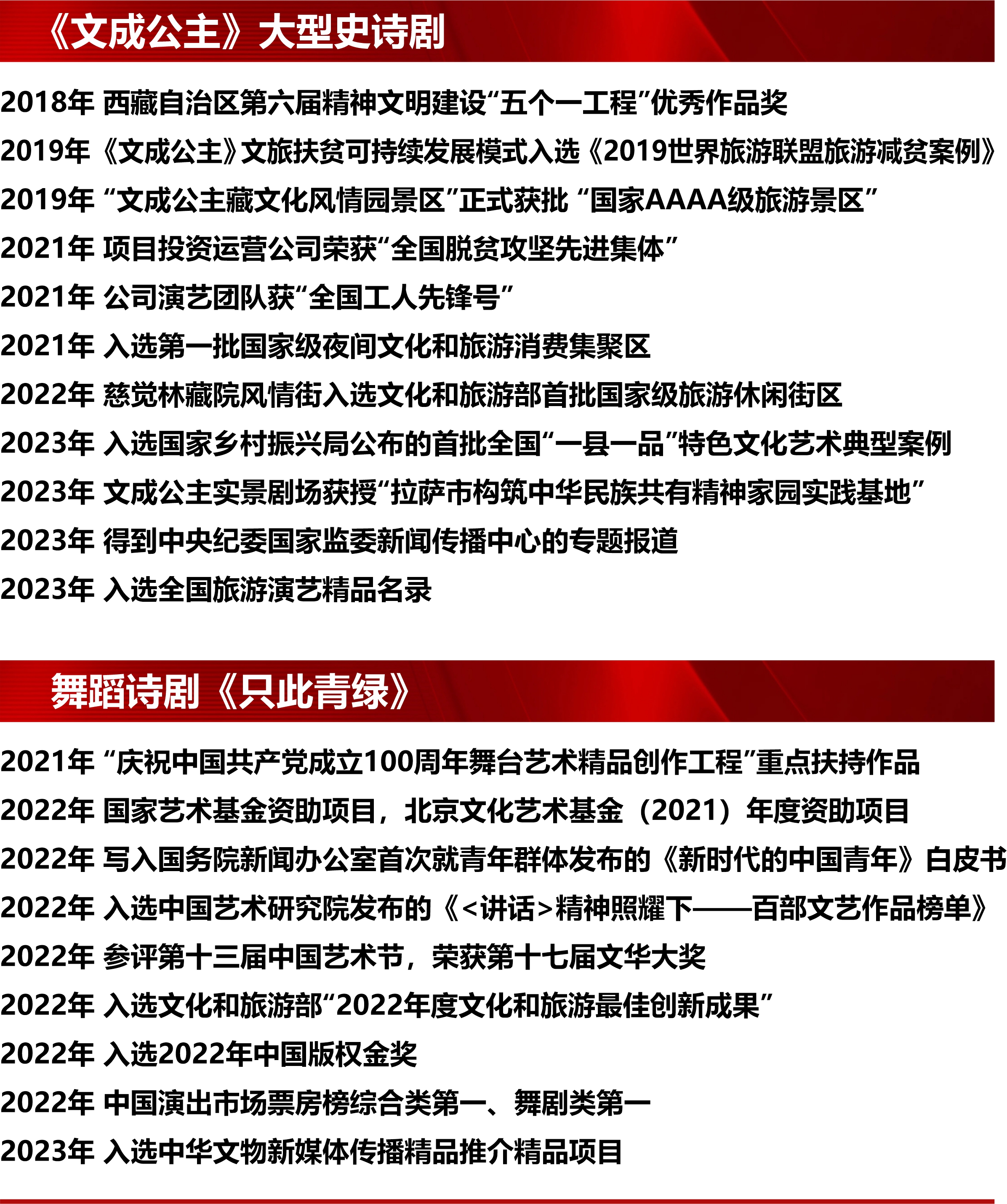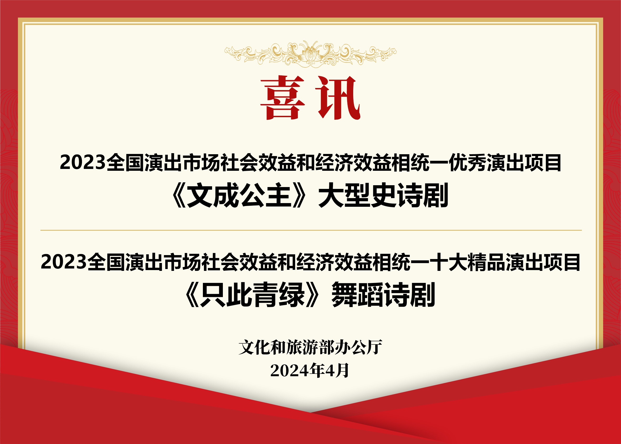四月捷報(bào)頻傳,域上和美集團(tuán)旗下項(xiàng)目再獲殊榮。文化和旅游部近日公布2023全國(guó)演出市場(chǎng)社會(huì)效益和經(jīng)濟(jì)效益相統(tǒng)一精品演出項(xiàng)目入選名單,域上和美文化旅游股份有限公司出品的《文成公主》大型史詩(shī)劇入選2023全國(guó)演出市場(chǎng)社會(huì)效益和經(jīng)濟(jì)效益相統(tǒng)一優(yōu)秀演出項(xiàng)目,故宮博物院、中國(guó)東方演藝集團(tuán)有限公司、人民網(wǎng)股份有限公司共同出品,域上和美文化發(fā)展有限公司聯(lián)合出品的舞蹈詩(shī)劇《只此青綠》入選2023全國(guó)演出市場(chǎng)社會(huì)效益和經(jīng)濟(jì)效益相統(tǒng)一十大精品演出項(xiàng)目。作為深耕文旅行業(yè)的大型領(lǐng)軍企業(yè),域上和美集團(tuán)勇?lián)厝?、主?dòng)作為,以持續(xù)的演藝經(jīng)典和產(chǎn)業(yè)貢獻(xiàn),服務(wù)文化旅游深度融合進(jìn)程,滿足廣大人民群眾的精神文化需求。